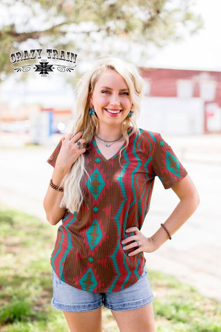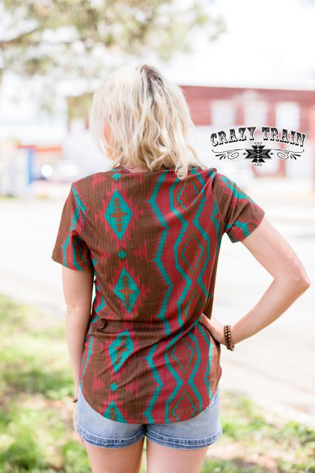Pictures do not do this shirt justice. It is amazing in person. Turquoise aztec pattern on a rust base color makes this shirt pop. This is a great transitional top going into fall or is perfect for those would like the earth tone colors. Super soft ribbed material that just flows and has a lot of stretch. Runs true to size.