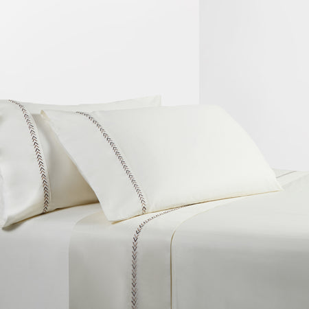 This set of beautiful cream sheets features a southwestern inspired embroidery for an understated, sophisticated look. The 350TC adds to a satin like softness for a refined elegance. Elevate your sheets experience with this gorgeous four piece king or queen sheet set that will lend luxury and style to your bedding ensemble. Imported. 4-PC Set Includes: (1) Flat Sheet, (1) Fitted Sheet, (2) Pillowcases Color: Cream, Tan & Burgandy Arrow Embroidery