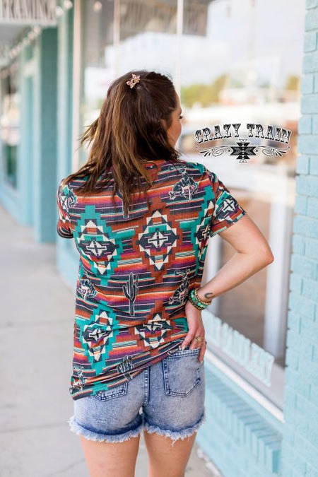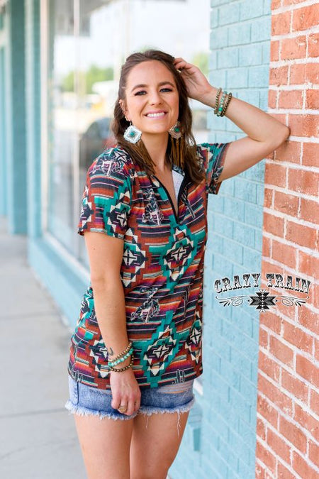 Welcome to the badlands! Tones of browns, rusts, and turquoise wrapped up in Aztec, serape, bucking broncs, and cactus rounds out the western tone. New zipper v-neck top that is super flattering. This top is made with a SUPER COMFY ribbed material with a bit of ranchyness in a favorite western print. Don't let the ribbed material fool you, this top is still very soft. Running true to size. Model is 5'6" and wearing a size small.