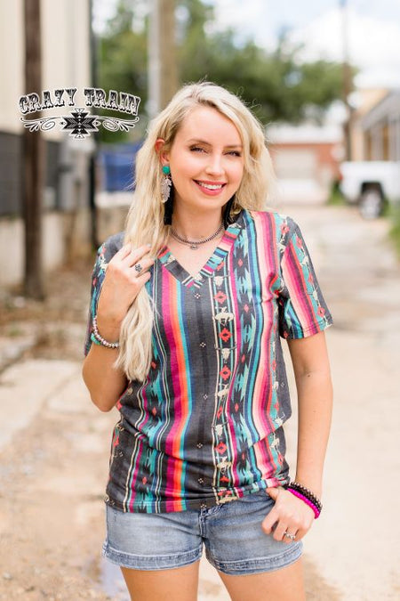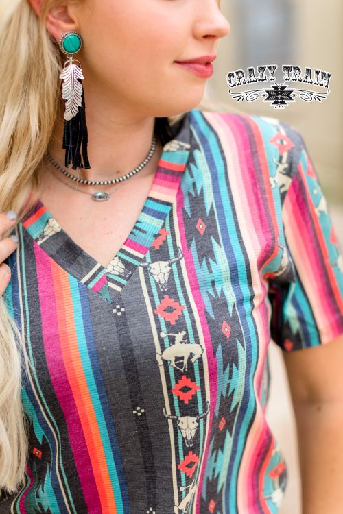 Bulls, Broncs, Aztec, Serape ... Yes Please! If you like western this is a must have shirt in your closet. This shirt is so soft and comfortable and will surely be a favorite in your closet.