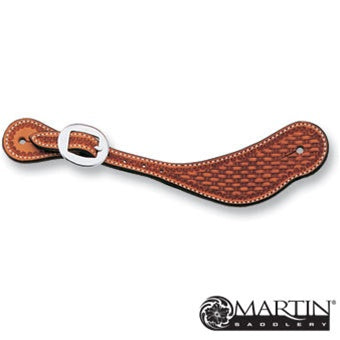 Cowboy Spur Straps, basket stamped, latigo lined, and sewn edges with stainless steel buckle by Martin Saddlery. Natural Skirting Leather.