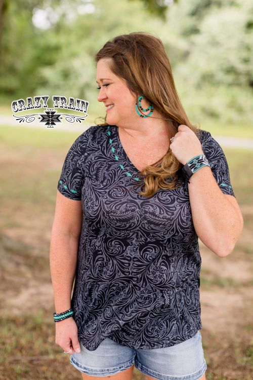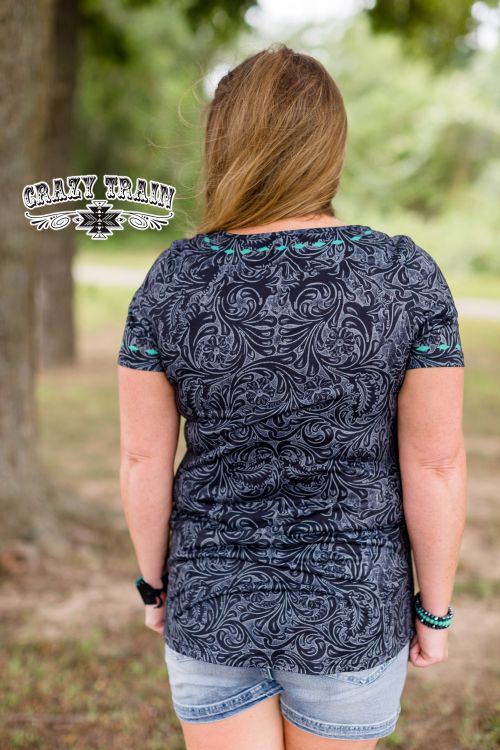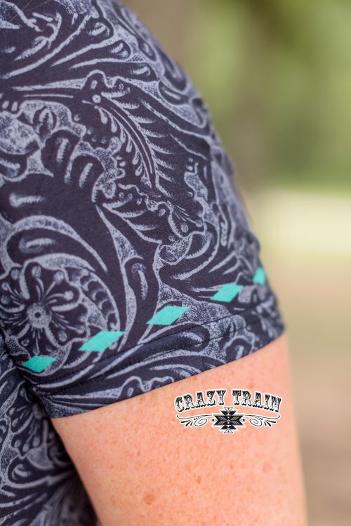 Where are my horseback riding girls at? This top is for you. Leather tooled design with a turquoise buckstitch look around the neckline and sleeves. This top is great for the western gals that like just a touch of color but not too much.