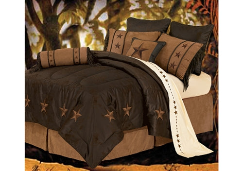 The doe-soft comforter, in quiet shades of brown with embroidered stars,